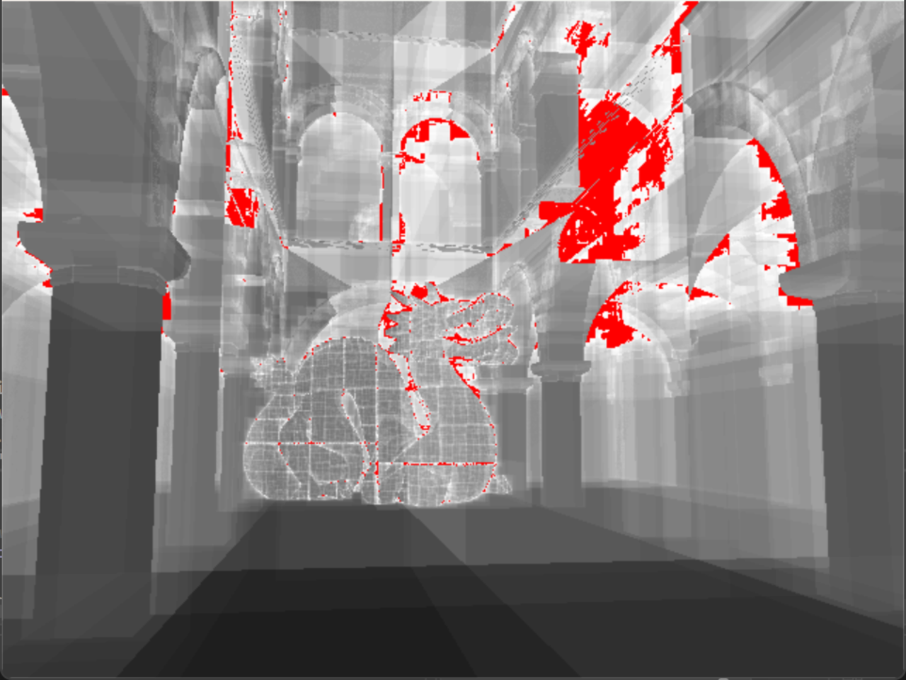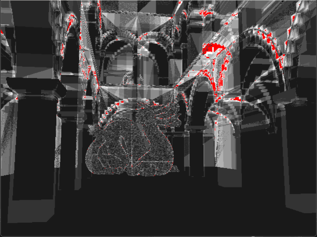 On the other hand, the Triangle Visualization tab shows how many ray-triangle intersection calculations are happening per pixel. The whiter the pixel, the closer it is to 20 calculations, and red means more. These calculations are more expensive, so it's ideal to keep them low.